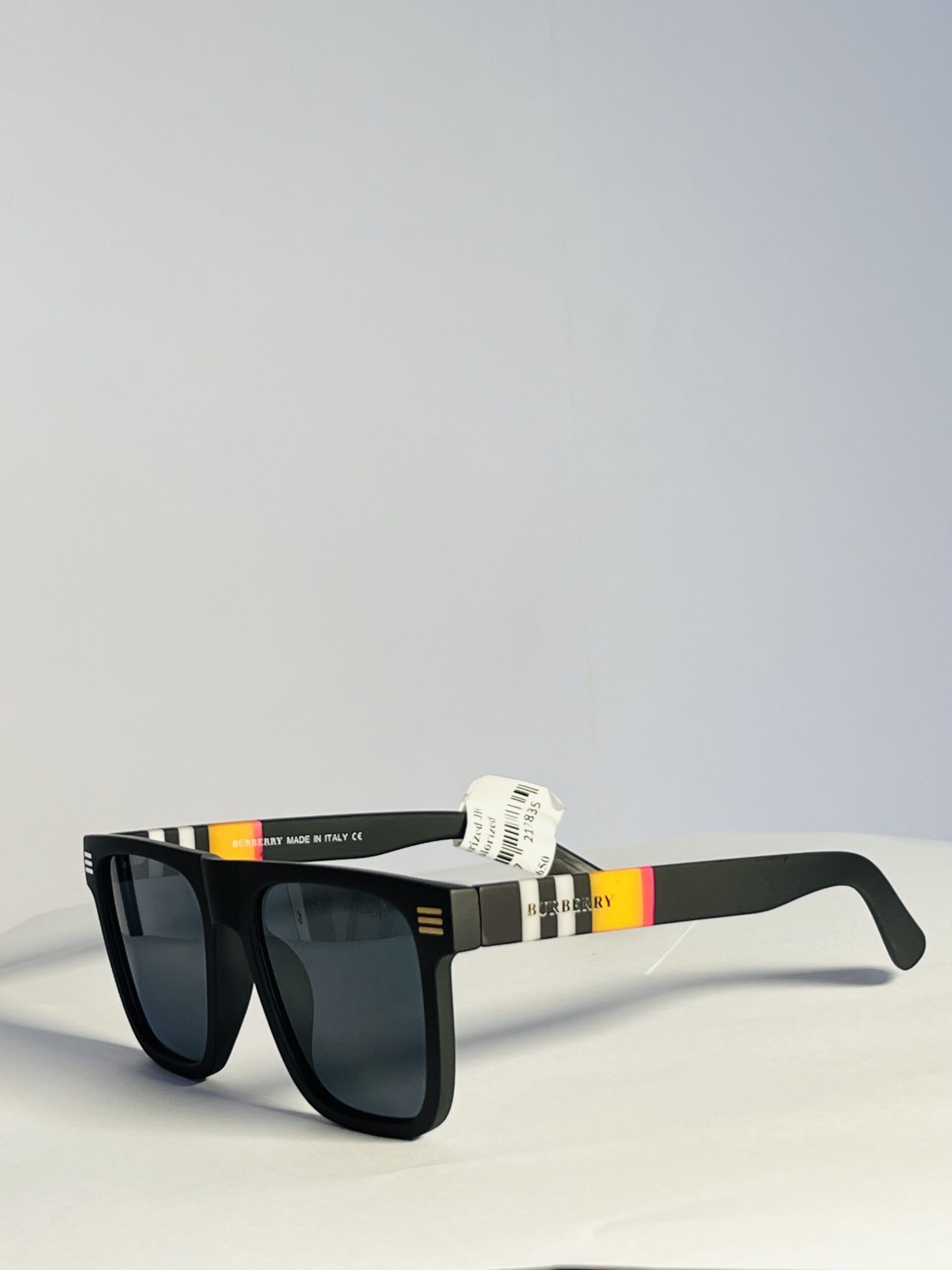Matte black frame with a playful pop of Burberry’s iconic stripes and vibrant red-yellow accents on the temples.