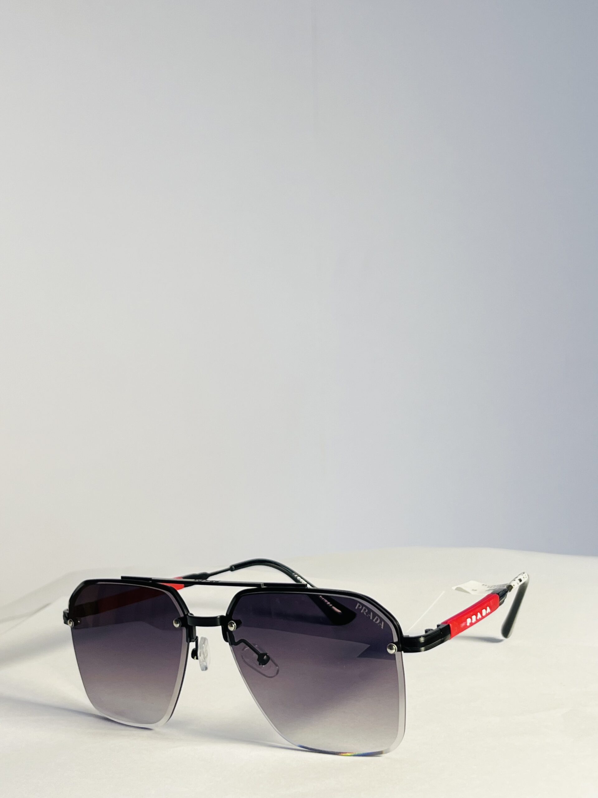 + Free ShippingThese Prada aviator-style sunglasses are sleek, sporty, and high-tech — featuring rimless gradient lenses, lightweight black frames, and a bold red logo accent on the arms.